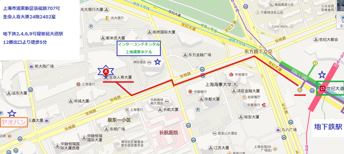 1.空港名:虹橋国際空港 Hongqiao International Airport (SHA) 距離約25キロ、タクシーで40分程度(地下鉄2号線で50分程度) 2.空港名:浦東国際空港 Pudong International Airport (PVG) 距離約 30キロ、タクシーで50分程度(地下鉄2号線で55分程度) 3.鉄道駅名: 上海駅 Shanghai Railway Station 距離約10キロ、タクシーで20分程度(地下鉄4号線で25分程度) 4.鉄道駅名: 上海虹橋駅 Shanghai Hongqiao Railway Station 距離約25キロ、タクシーで40分程度(地下鉄2号線で50分程度) 5.地下鉄駅名: 世紀大道 Centure Ave.Station 2,4,6,9号線12番出口から約0.3 キロ(徒歩5分)